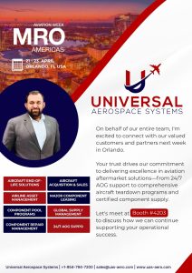 Universal Aerospace Systems is an aftermarket aircraft parts supplier for airframe and engine parts of commercial and military aircraft . We take pride in our customer satisfaction and knowledge of the aviation industry to provide you with 24/7 AOG support by being strategically located in Miami.